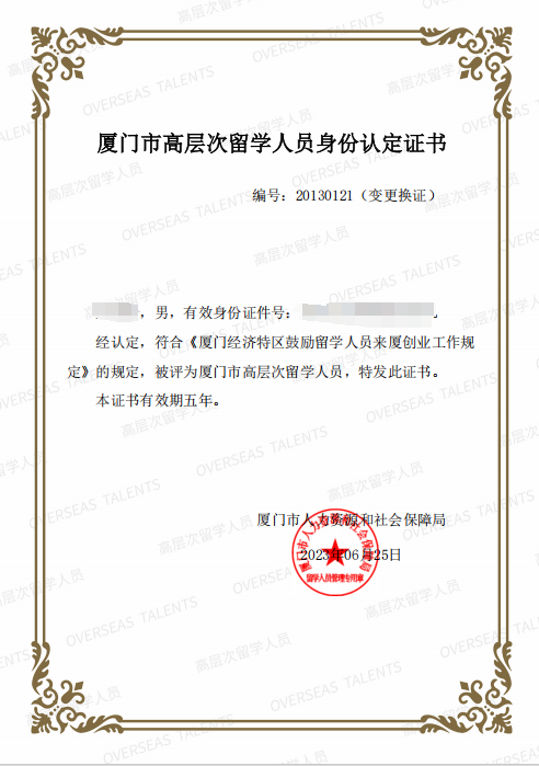 廈門市高層次留學(xué)人員身份認(rèn)定證書