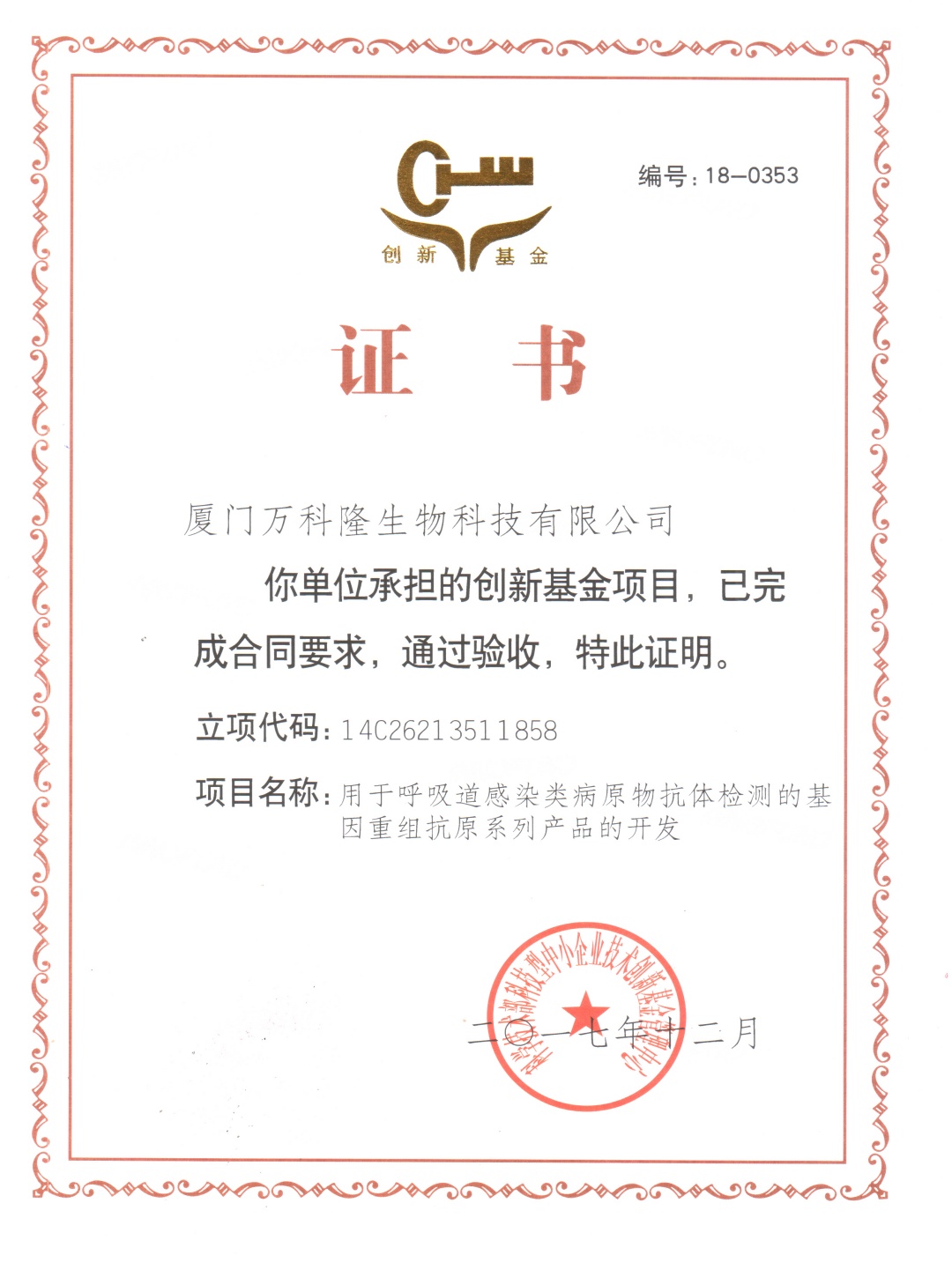 科技型中小企業(yè)技術(shù)創(chuàng)新基金立項(xiàng)證書